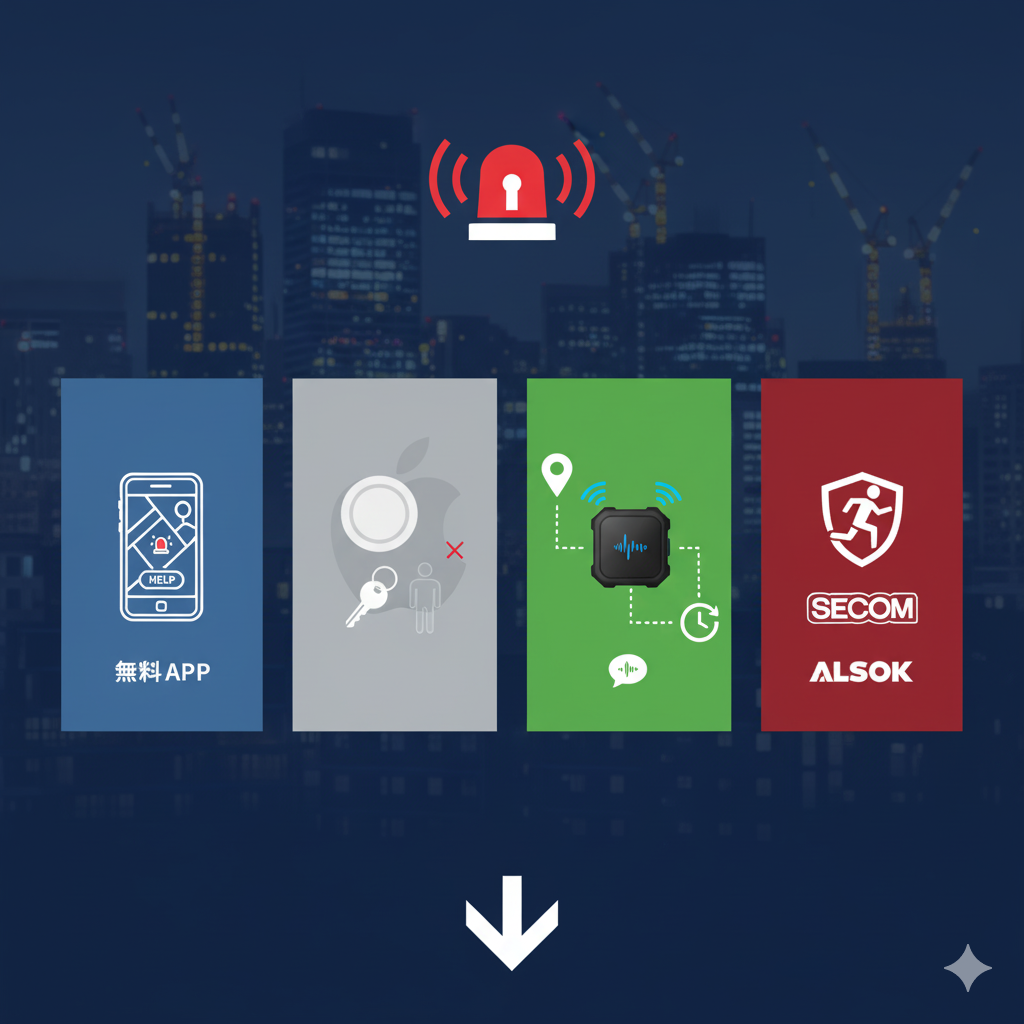 | 評価軸 | デジポリス (無料アプリ) | AirTag (紛失防止タグ) | 一般向けGPS端末 | 警備会社系GPS端末 |