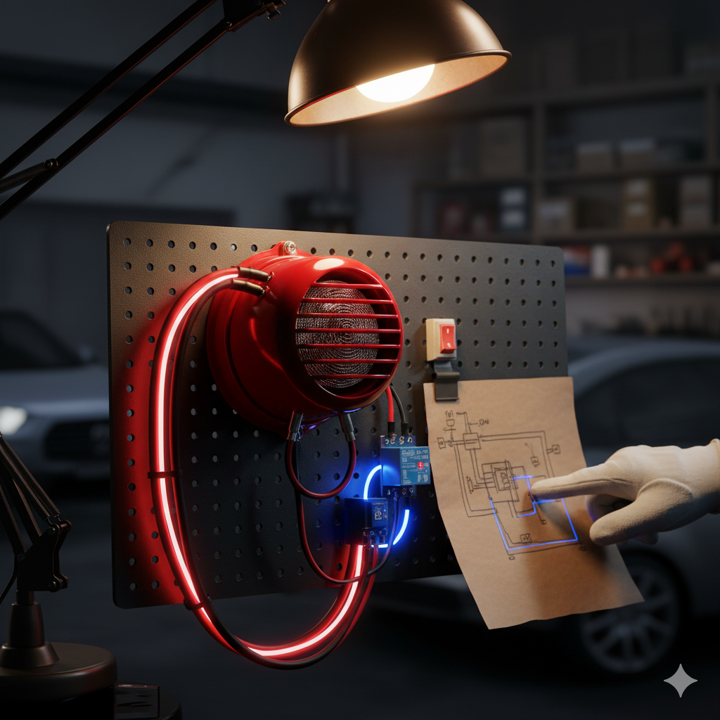 この回路が、実際にサイレンを鳴らします。太いコードを使い、必ずヒューズを入れます。