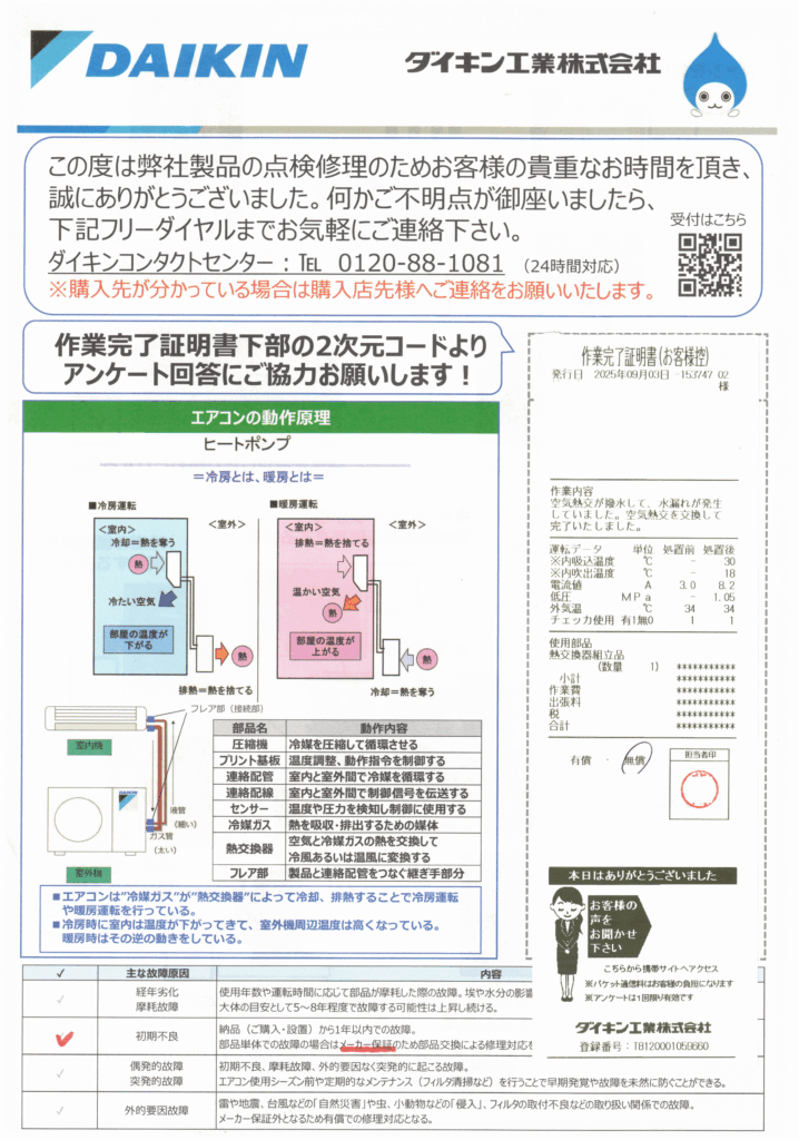 修理担当者の方が持参した修理明細書を見ると、「初期不良・熱交換器の交換」と記載されていました。