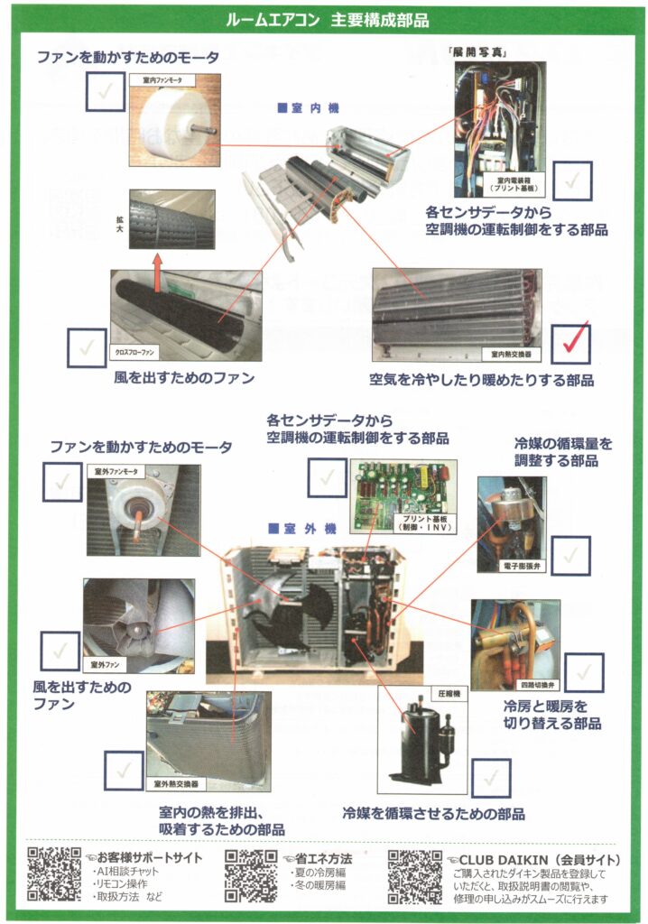 - 主要な部品: 圧縮機、熱交換器、膨張弁、ファンモーターなど、各部品がそれぞれの役割を果たしていることが図解されていました。