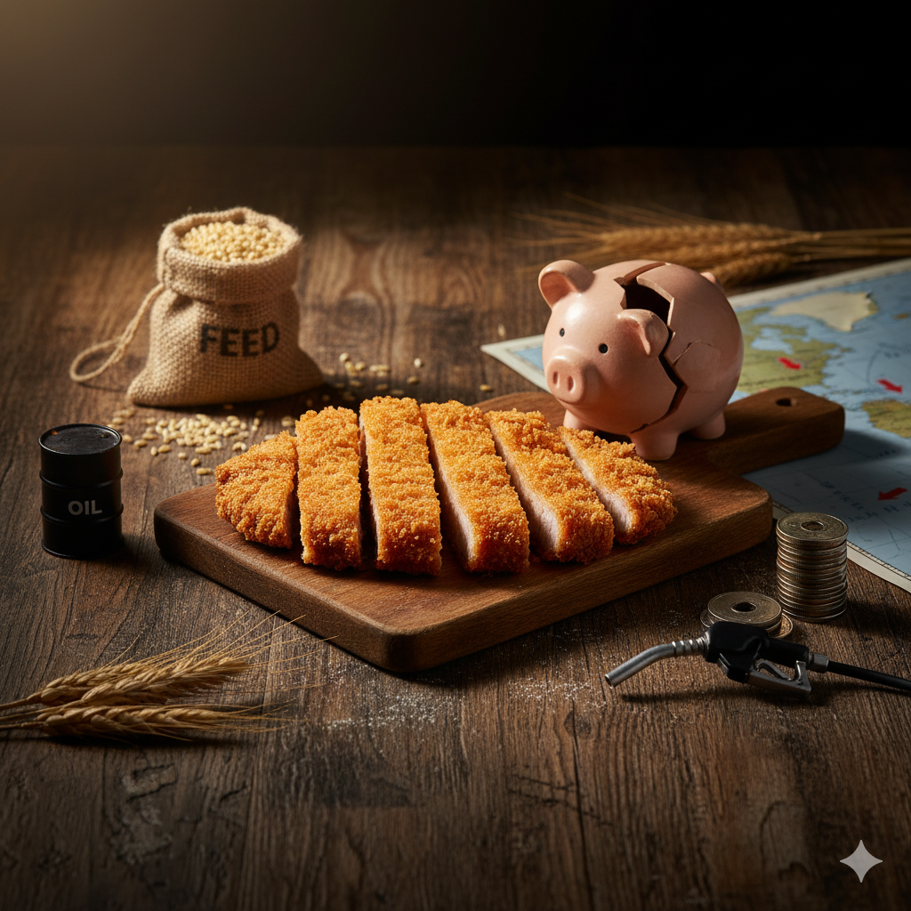 原油価格が上昇すると、これらのコストが一斉に跳ね上がります。トンカツは原材料の輸入依存度が高く、冷凍・冷蔵保存が必要なため、この 「オール・インフレ」 の影響を極めて強く受けるのです。