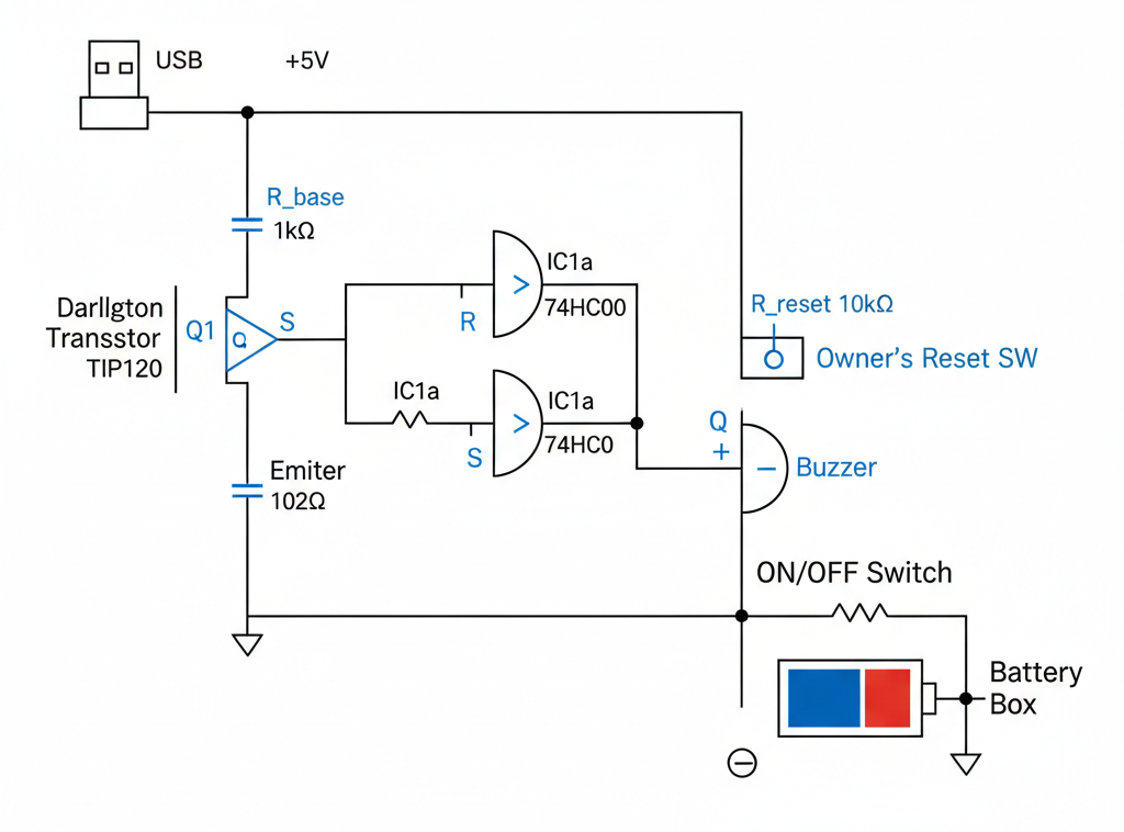 - 仕組み: 盗難犯がキーを回しUSBに電気が流れると、トランジスタがONになり、NAND ICのS入力に信号が入ります。