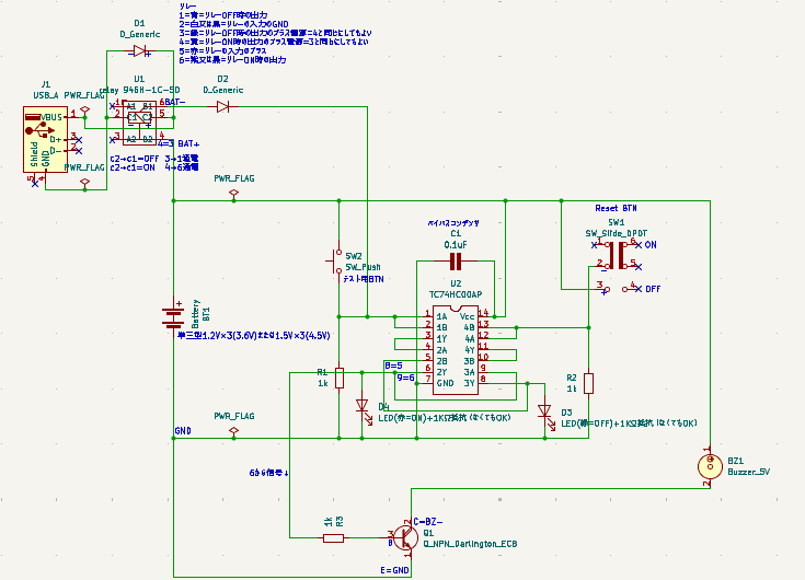 - NAND IC出力 → ブザー(ブザー電源は電池)